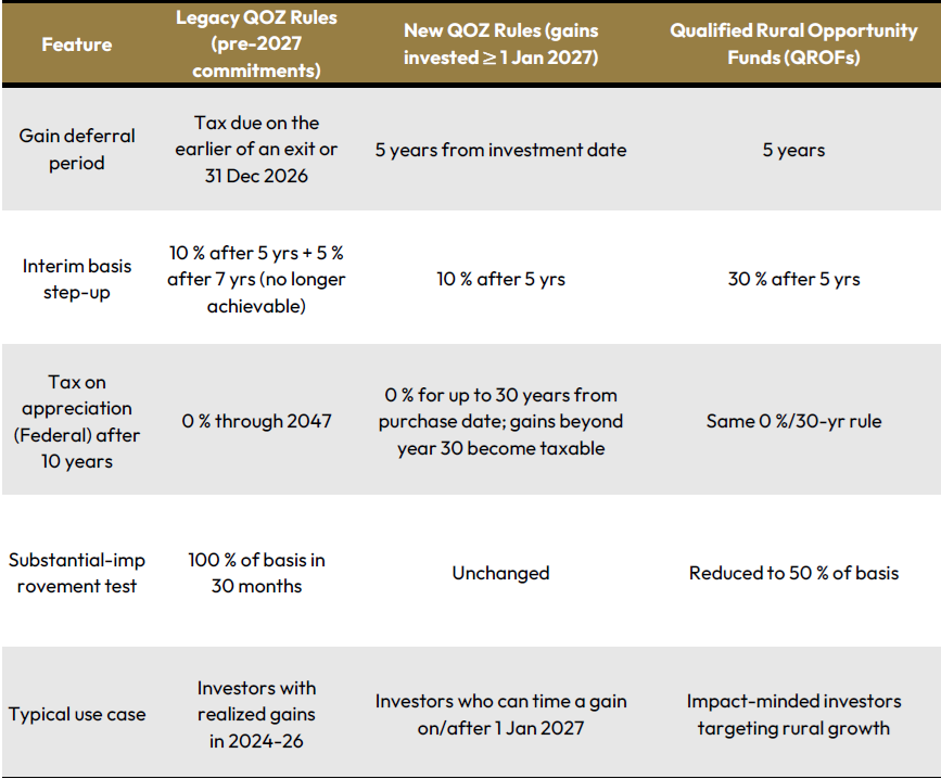 OBBBA’s revamped QOZ framework re‑opens the programs best tax‑alpha window starting 2027, while the newly created Rural Opportunity Funds offer an even richer incentive set for investors willing to deploy capital beyond the typical urban corridors.