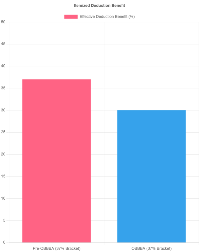 The Act permanently preserves the doubled standard deduction from the TCJA, ensuring that the baseline deduction stays at $15,750 for single filers and $31,500 for married joint filers for 2025 (slightly higher than 2024 due to inflation) and continues to adjust with inflation thereafter. By keeping the standard deduction high and personal exemptions at $0 (they remain repealed), OBBBA continues the trend of simplifying filing for many taxpayers. However, for those who do itemize (often higher income with larger deductible expenses), new limits have been introduced that will especially affect top earners.