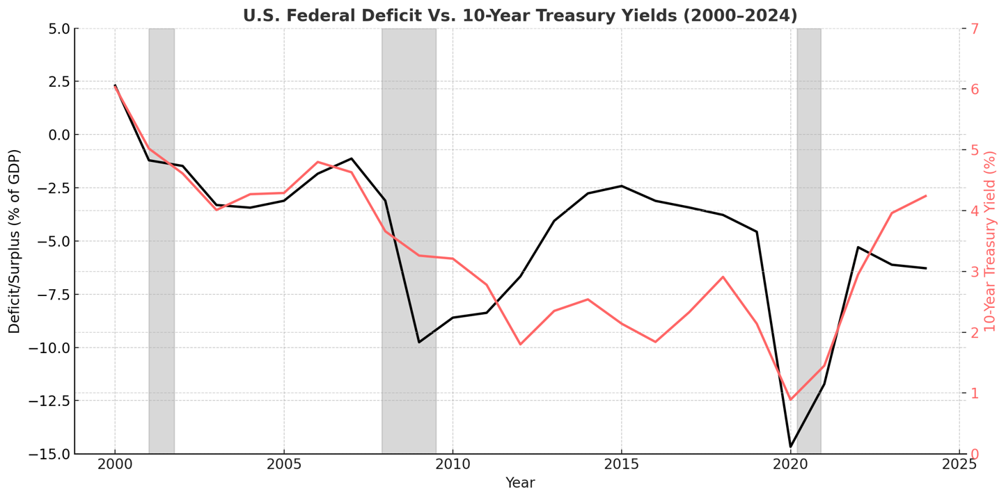 A government budget deficit arises when expenditures exceed revenues over a specified period, typically a fiscal year. This gap is financed through borrowing, most often by issuing government bonds. In the United States, persistent deficits have led to a growing national debt, sparking debates as the debt has grown through the years. Many times in the recent past, interest rates were near zero (ZIRP), and interest payments were low. Post Covid-19, with inflation returning and the Federal Reserve raising rates to combat it, our deficits have once again become a concern. Two areas of particular focus are the effects of deficits on stock market returns and interest rates—key indicators of economic performance and investor sentiment. While conventional economic theory offers some predictive power in understanding these relationships, real-world outcomes are shaped by complex interactions between monetary policy, investor behavior, and global capital markets.