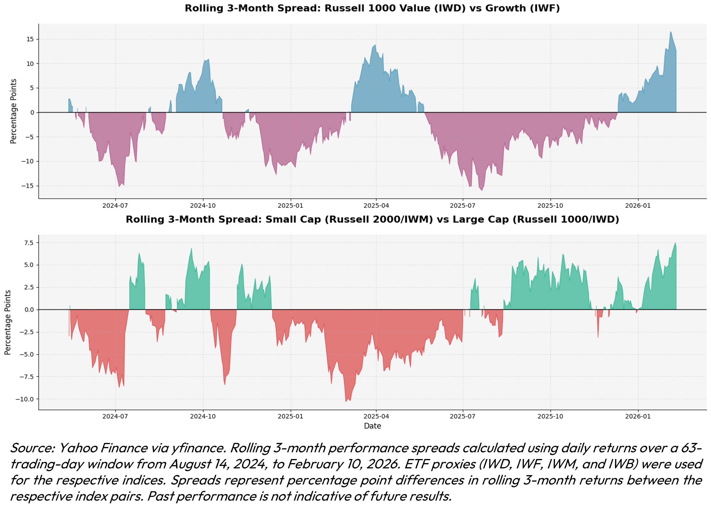 We believe, however, that we must apply a bit of skepticism, for while the January barometer has a very good historical record we believe this January rally contained other important information that can be used to understand what may lie ahead for markets in 2026. To delve deeper into our discussion on the "January Barometer," we need to discuss the market internals of January 2026. While the S&P 500’s 1.5% gain provides the headline, the real story of the year is found in the massive divergence between sectors and styles.