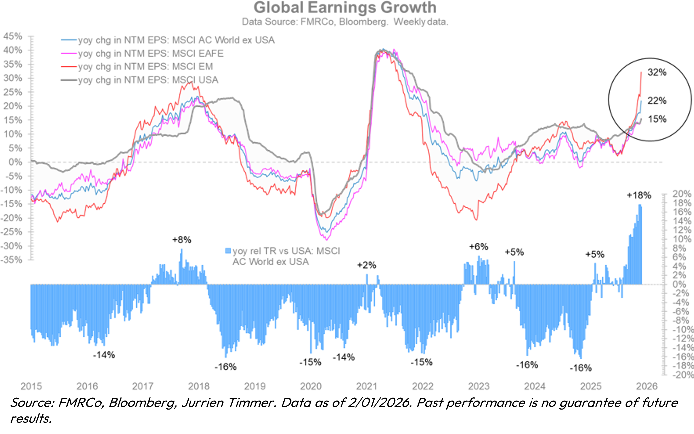 But while monthly sectors ranking can come and go, the real attention grabber for us was the fact that large capitalization US stocks was the worst performing style for the month. International, Emerging Markets, US Small Cap and US Mid Cap all outperformed. We believe this will prove to be the beginning of a change in trend that began happening in late 2025 and has continued into this year.